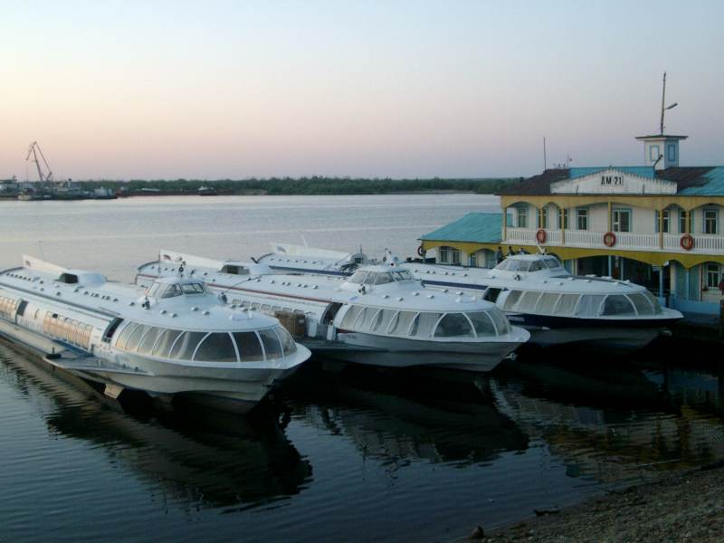 Um kurz nach vier beginnt das Wiegen des Gepäcks. Sämtliche Passagiere, bis auf uns, müssen dafür zurück hinter die Absperrung. Unsere Rucksäcke dürfen wir durch eine Nebentür als erste auf die Waage stellen. Als erste betreten wir anschließend auch das Boot. Die Raketa ist wie ein Flugzeugrumpf gebaut. Rechts und links des Mittelganges jeweils drei Sitze, in der vordersten Reihe nur jeweils zwei. Insgesamt sind es 12 Reihen. Wir belegen die erste Reihe. Die Fenster am Bug sind undurchsichtig verriegelt. Hinausschauen kann man nur aus den Seitenfenstern, die etwa einen halben Meter über der Wasserlinie liegen. Im Heck befindet sich eine Bank und man kann während der Fahrt draußen sitzen und den Blick über die Lenaufer schweifen lassen. Eine Treppe führt von hier aus nach oben in die Pilotenkanzel. Der Kahn ist schätzungsweise 6 m breit und 20 m lang. Einen separaten Gepäckraum gibt es nicht. Die Gepäckstücke verteilen sich in dem relativ breiten Mittelgang und vor den Sitzen. Charly klebt seine Wanderstiefel mit Pattex jedoch ohne nachhaltigen Erfolg. Die gesamte Sohle löst sich vom Schuh, weil die Zwischenschicht vollkommen zerbröselt ist. "Erst 11 Jahre im Einsatz, das Schreiben an den Hersteller wird sich gewaschen haben", denkt er bei sich und dreht die Tube wieder zu. Die Raketa geht ordentlich ab und macht weit weniger Krach als