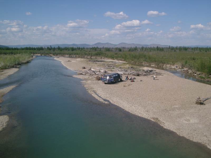 Kurz vor der Grenze zur Region Magadan qualmt es im Motorraum. Ein angeschmortes Kabel! Während die beiden Fahrer den Fehler mit Isolierband beheben, präpariert sich Volker mit Autan die Klo rolle schon griffbereit. Die Flasche nimmt er natürlich mit es werden ja noch weitere Körperteile freigelegt. Es gibt zwar viele kleine Blaubeersträucher hier, aber es sieht nicht so aus, als würde noch eine reichhaltige Ernte herauskommen. Sie blühen zwar, doch die meisten sind aufgrund der Trockenheit fast gänzlich verdorrt. An den Flussufern liegen teilweise noch ausgedehnte Eisreste. Sie tauen im kurzen Sommer nicht vollständig weg.In Magadan Oblast wird die Straße schlaglochartig schlechter. Bei den Flussdurchfahrten schwappt die Bugwelle einige Male über die Windschutzscheibe. Befahrbare Brücken existieren nicht, obwohl die eigentlichen Brückenpfeiler aussehen, als wären sie noch intakt, aber die Auf- und Abfahrten fehlen. Trotz der teils spektakulären Flussquerungen, stellen diese nicht das größte Problem dar. Unübersichtlicher, weil in ihrer Tiefe nicht abschätzbar, sind die Schlammseen mitten auf der Piste. Schmelzwasser, das sich an diesen Stellen gesammelt hat. Eine Vertiefung, welche für einen großen LKW der Marke "Ural" kein Hindernis darstellt, kann für unser kleines Kastenbrot schon zum Problem werden trotz Vierradantrieb, Differentialsperre und höhergelegtem Geländefahrwerk! Einmal ist es fast so weit gewesen beinahe wäre die Karre umgekippt! |