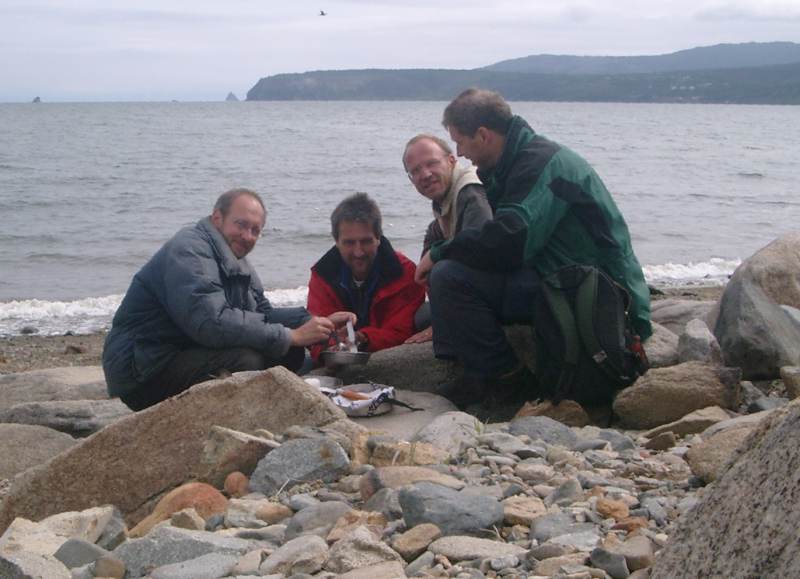 Thema nochmals anzusprechen; vorausgesetzt, dass wir Marija nochmals treffen. Die Schuhmode in Jakutien und Magadan steht im krassen Gegensatz zum Zustand der Straßen hier. Streng genommen dürften die hier nur Wanderschuhe tragen. In diesem Zusammenhang merkt Volker an, dass die Dellen im Parkett des Museumsbodens von den Stöckelschuhen stammen. Worauf der alles achtet! Auch die Kleidung der Frauen im Fernen Osten Russlands überrascht! Solche luftigen um nicht zu sagen gewagten Kreationen haben wir in dieser Ecke der Welt nicht erwartet. Nun ja, auch hier ist Sommer und auch hier gibt es schöne Frauen. Wir haben uns entschieden, dem Vorschlag des Mädels aus St. Petersburg zu folgen und die Gertnerbucht zu besuchen. Falls es mit den Fischen wider Erwarten doch nichts werden sollte, wappnen wir uns mit allem, was wir noch in unserem Gepäck haben: Die gesamten Pfannkuchenutensilien (Trockenei, Schnellmehl, Zucker), Tütensuppen und Müsliriegel wandern in unser Daypack. An der Bushaltestelle beobachten wir das sonntägliche Treiben. Viele Leute fahren auf ihre Datscha etwas außerhalb der Stadt. Die Stielhacke oder der Spaten werden unfallsicher in Stoff oder Papier gehüllt. Fast zwei Stunden warten wir an der Haltestelle! Angesteckt von der Magadaner Sonntagslethargie? Punkt 12:22 Uhr kommt dann der Bus genau wie im Museum ins Büchlein notiert, man muss nur hineinschauen. Mit dem alten klapprigen Gefährt geht es dann Richtung Ochotskisches Meer. In der Bucht ist richtig was los. Im Abstand von 60 bis 70 Metern sind etwa 10 bis 15 Meter lange Netze ausgelegt. Sie werden mit kleinen Schwimmern an der Oberfläche gehalten (ähnlich einer Bahnabtrennung im Schwimmbad). Die Netze reichen bis ans Ufer und sind dort verankert. Die Fischer hangeln sich in kleinen Schlauchbooten entlang der Netze und sammeln die Fische ein. Schätzungsweise sind 25 bis 30 Netze in der ganzen Bucht ausgelegt. Wir marschieren am Strand entlang und dann weiter auf der felsigen Seite der Bucht. Es scheint eine beliebte Sonntagsbeschäftigung zu sein, die Fische direkt an Ort und Stelle zuzubereiten. Zum Teil nicht mal ausgenommen bruzzeln die lachsartigen 50 bis 70 cm langen Fische auf dem Rost. Daneben köchelt ein großer Topf mit Fischköpfen vor sich hin. Familien mit Kindern und Gruppen von jungen Leuten picknicken am Strand und auf den Felsen.Wir stellen mit Erstaunen fest, dass wir für unsere Pfannkuckenbackaktion gar kein Wasser mitgenommen haben; und mit dem Salzwasser aus der Bucht wollen wir es dann doch nicht versuchen. "Was haltet ihr denn von einem kleinen Fischlein?" werfe ich ein, als wir den Fischern zus ehen, wie sie die Fische geradezu ernten. Volker kann gar nicht glauben, wie viele Fische hier in so kurzer Zeit aus der Bucht gezogen werden. Nun ja, wahre Jubelstürme löst mein Vorschlag nicht gerade aus, aber man ist durchaus bereit, mich gewähren zu lassen. Getreu dem Motto: Wenn de Jung singe Spaß dran hätt!Für eine Fischmahlzeit fehlen uns noch einige unverzichtbare Zutaten. So findet Volkers Vorschlag, dass er und Jürgen losgehen um das Notwendige zu besorgen und Charly und ich uns um den Fisch kümmern sollen, allseits Zustimmung. Die Zwei fahren also mit dem Bus einige Stationen zurück und stehen gut anderthalb Stunden später mit Piwo, Chleb und Wodka wieder auf der Matte. Diese Zeit reicht natürlich aus, um von den Fischern ein etwa 50 cm langes Exemplar zu erstehen. 50 Rubel (1,65 ) bezahlen wir für das Fischlein. Ich muss wirklich mehrfach "njet" sagen, denn die Jungs wollen mir unbedingt gleich mehrere Fische verkaufen.Also dreckig sehen sie nun wirklich nicht aus die Fische eher schon die Fischer. Vielleicht hat Marija das ja nur verwechselt. Jetzt müssen wir erstmal einen geeigneten Stein finden, auf dem der Fisch ausgenommen und filetiert werden kann. Den Fischkopp kochen und das Vieh unausgenommen auf ein rostiges Stück Drahtgeflecht legen, das hier am Strand herumliegt, ist unsere Sache nicht. Also erfolgt die Zubereitung auf deutsche Art: Der Fisch wird ausgenommen und in pfannengerechte Stücke filetiert! Die Würze erfolgt jedoch nach klassischer Magadaner Art: Wodka, Salz und Jürgens Spezialgewürz gut vermengen und darin die Filetstücke marinieren. Dass sich die Stücke dann in der Pfanne in eine Art Fischragout verwandeln, tut dem Geschmack keinerlei Abbruch. Der Fisch ist eine Art Lachs wahrscheinlich Stint mit rosafarbenem Fleisch und sehr kleinen Schuppen.