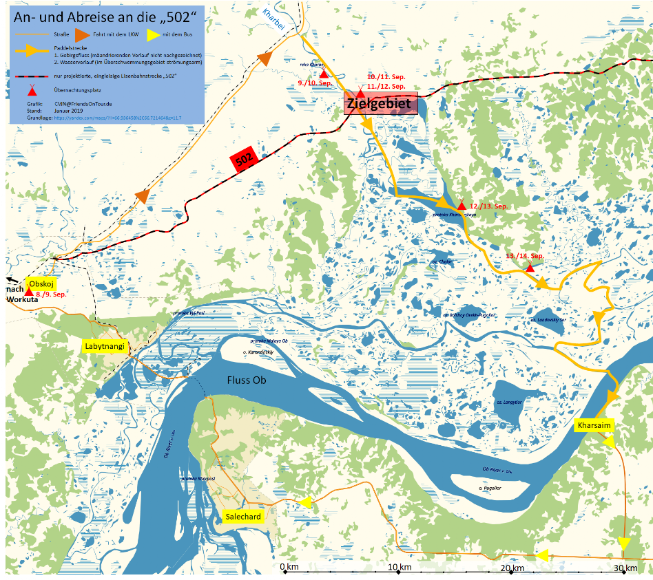 Von Workuta fahren wir mit dem Zug über den Polar-Ural bis Obskoj, das liegt kurz vor Labytnangi. Dann geht es mit einem LKW weiter bis an den Fluss Charbei. Dort setzen wir unsere Boote ein und paddeln – unterbrochen von mehreren Exkursionen an der "502" – bis zum Ob. Wir queren diesen und landen in der Ortschaft Charsaim an. Mit dem Minibus fahren wir von dort nach Salechard.